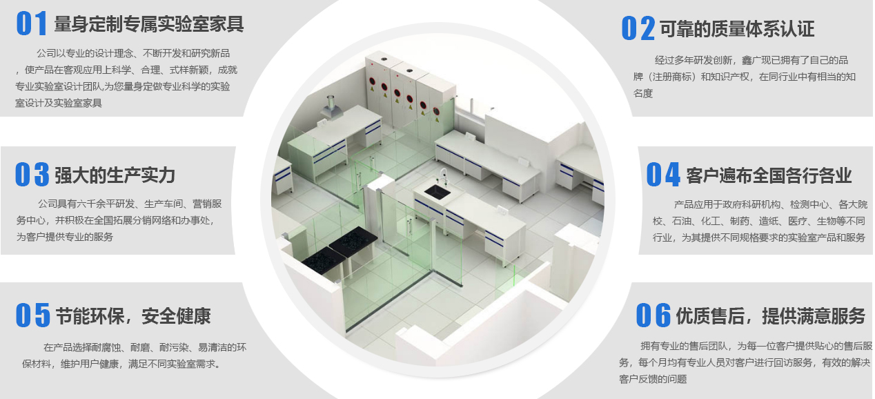山東鑫廣實驗設備科技有限公司成立于2007年,是一家位于山東濰坊的實驗室家具工廠。作為實驗室整體解決方案服務商,我們提供從實驗室規(guī)劃、實驗室設計、實驗室裝修、實驗室工程、實驗室家具、實驗室設備、到實驗室服務等實驗室建造一站式服務,致力于專業(yè)研發(fā)、設計、生產(chǎn)實驗室家具等產(chǎn)品及相關配套設備,并提供實驗室建設全套解決方案的新型高科技企業(yè)。公司下設研發(fā)加工工廠、營銷服務中心,并積極在全國拓展分銷網(wǎng)絡和辦事處,為客戶提供更專業(yè)、優(yōu)良的產(chǎn)品和服務。